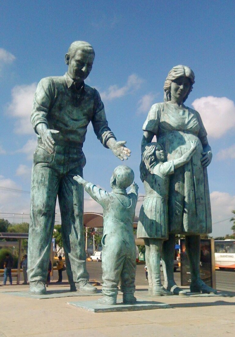 Imagem da obra de arte "La Familia" é uma escultura de bronze realizada pelo artista jalisciense Miguel Michel, situada na cidade de Querétaro, México. Esta obra representa um tema familiar e faz parte do patrimônio escultórico da região, destacando-se pelo trabalho em bronce do autor.